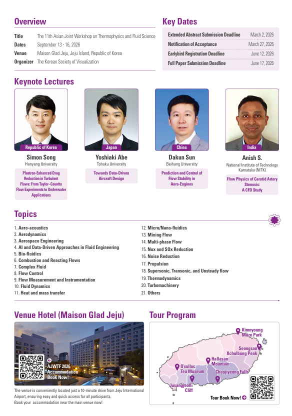 제11회 아시아 열물리 및 유체공학 학술대회 (AJWTF 2026: Asian Joint Workshop on Thermophysics and Fluid Science 2026)에 관심있는 회원님들을 초대합니다.